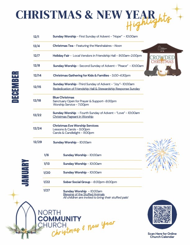 Visit our calendar for the latest events. And print this handy flyer to refer to from home with important dates for Advent, Christmas and New Years!